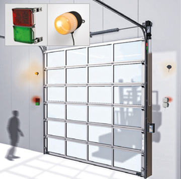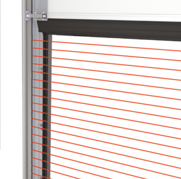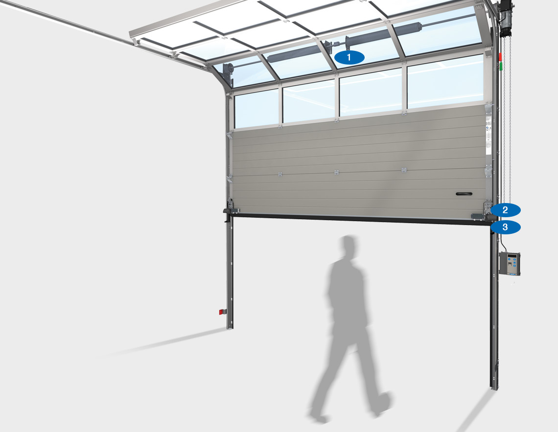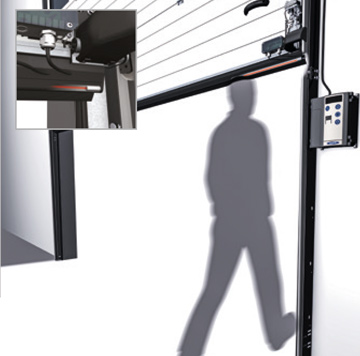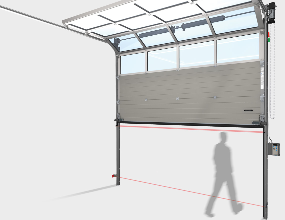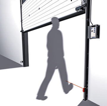 Für Tore mit Impulssteuerung, bei denen der Benutzer bei der Bedienung des Tores die Toröffnung nicht sehen kann, ist eine Sicherheitslichtschranke vorgeschrieben. Zwei Versionen sind verfügbar: Eine Version mit Sender und Reflektor und eine Version mit Sender und Empfänger. Bei beiden Systemen befindet sich der Sender an der Laufschiene auf der Seite des Steuerungsteils, auf der gegenüberliegenden Laufschiene befindet sich ein Refl ektor oder Empfänger. Wenn der Strahl zwischen dem Sender und dem Reflektor/ Empfänger unterbrochen wird, erhält der Antrieb ein Signal, das ihn stoppt und die Bewegung umkehrt. Die Version mit Refl ektor ist störanfällig bei Staub und Feuchtigkeit, bei der Version mit Empfänger ist das kein Problem.