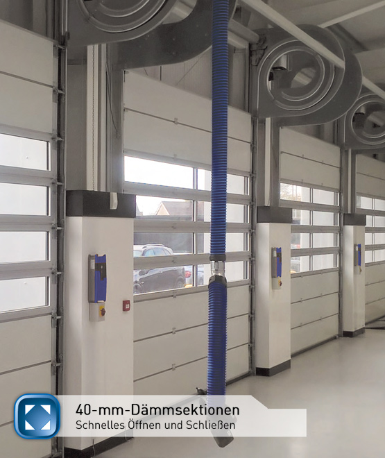 In der AUTOMOBILBRANCHE laufen Fertigungsstraßen oft von einer Halle in eine benachbarte. Schnelllauftore unterstützen die Erhaltung des Klimas in den Hallen und helfen, Energie zu sparen, während sie gleichzeitig die einzelnen Bereiche voneinander separieren, sodass Staub, Schmutz und Lärm sich nicht ausbreiten können. Die Schnelllauftore sind in die Prozesssteuerung integriert, sodass ein unterbrechungsfreier Ablauf der Fertigung sichergestellt ist.